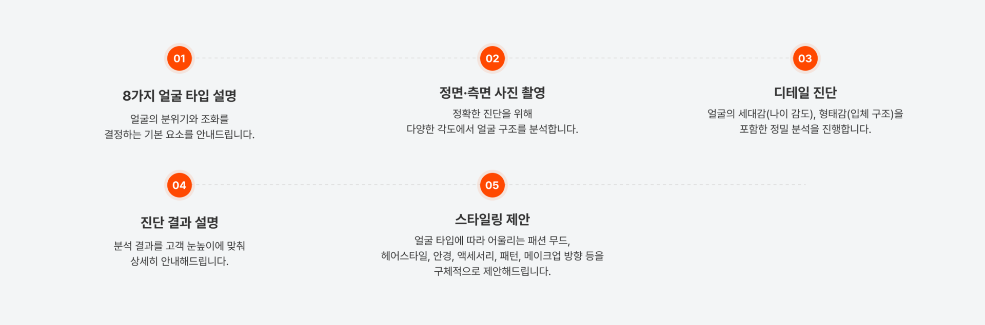 진단 결과를 바탕으로 가장 잘 어울리는 패션 스타일, 헤어스타일, 안경, 액세서리, 메이크업 등을 제안해 드립니다.